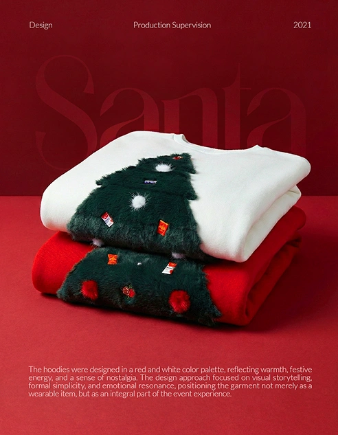 SANTA Project is a conceptual design experience positioned at the intersection of fashion, culture, and nostalgia. The project involved the creation of an exclusive Christmas hoodie designed specifically for a private corporate celebration, produced in a limited edition solely for that event.